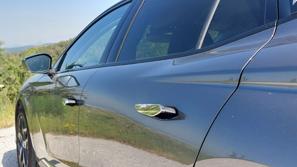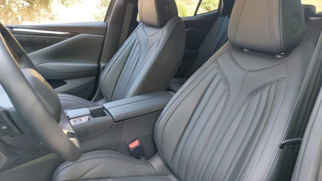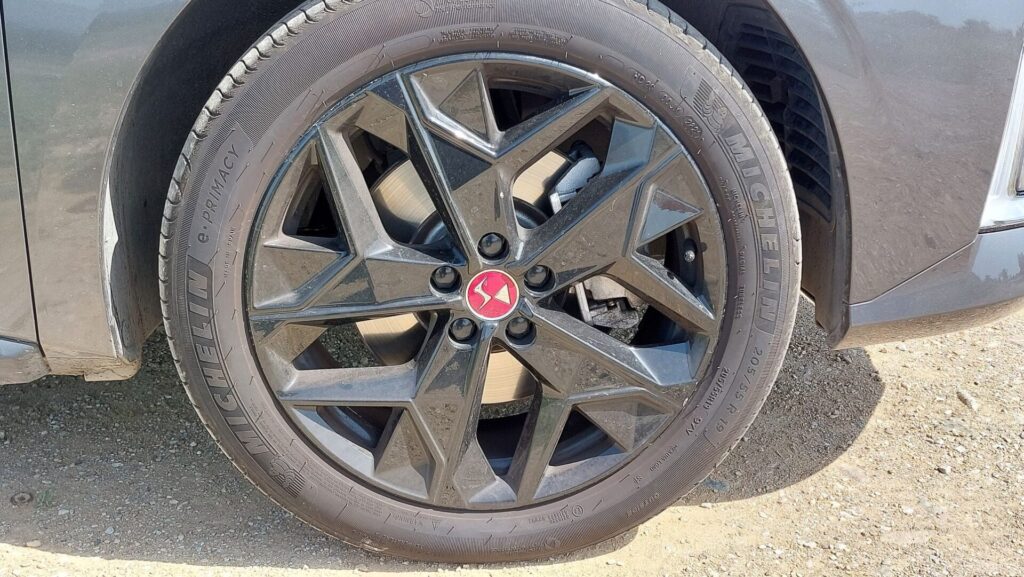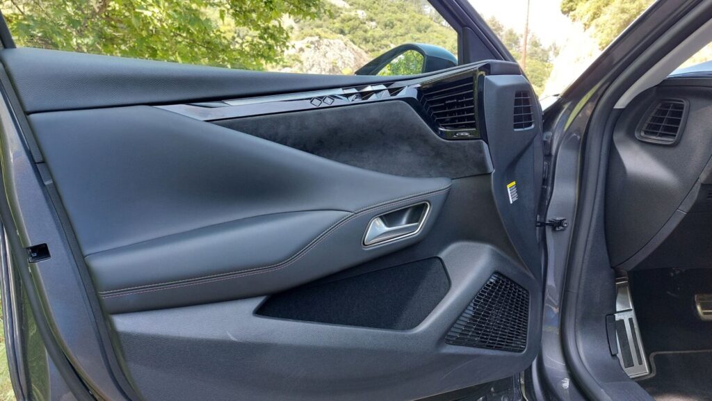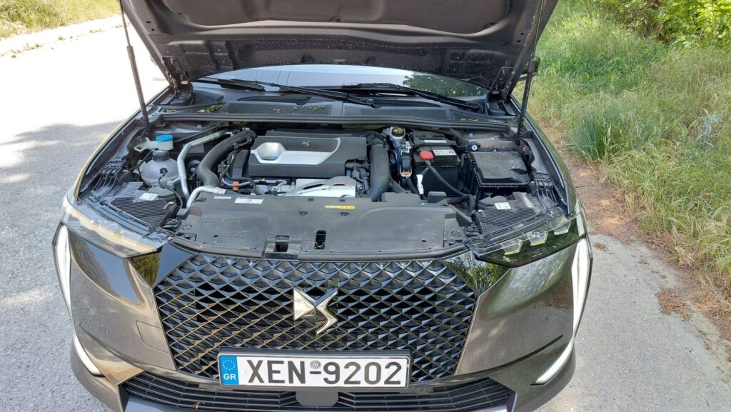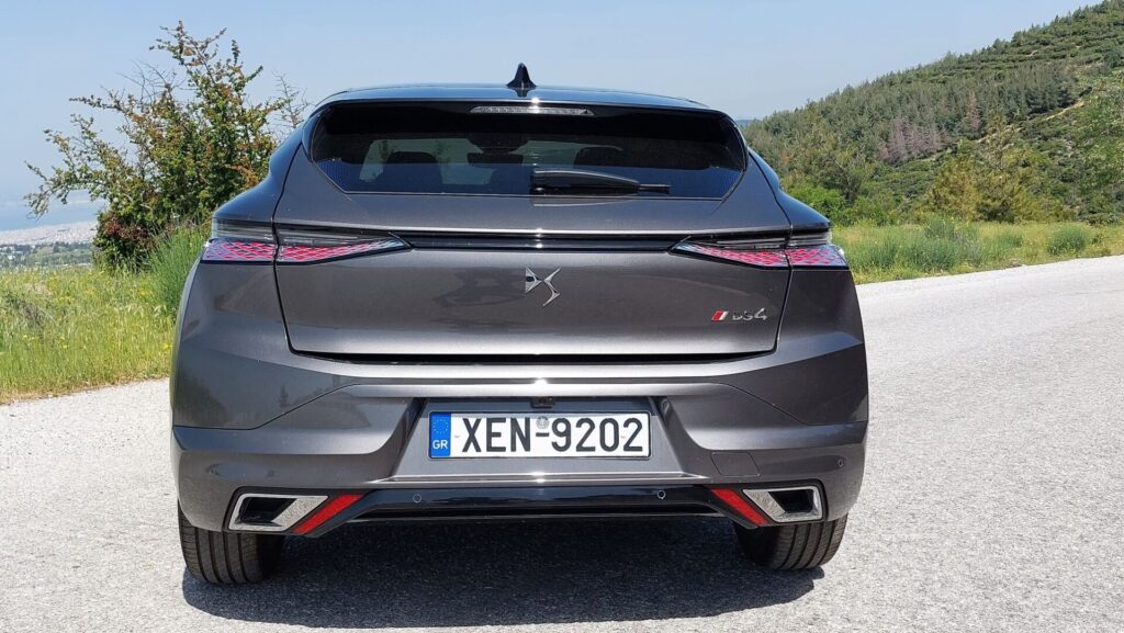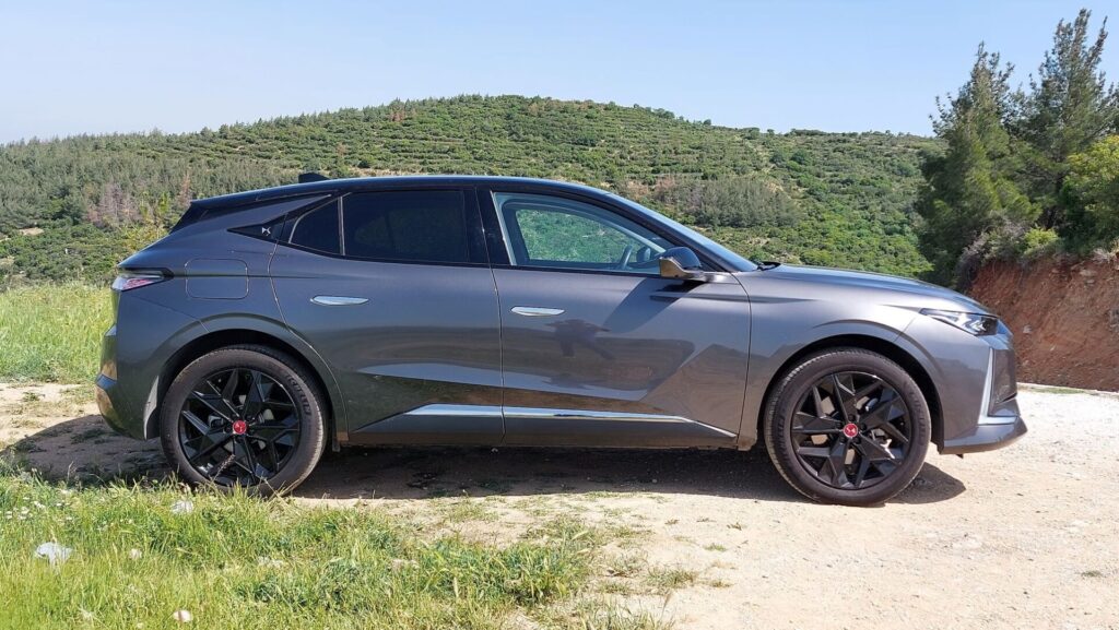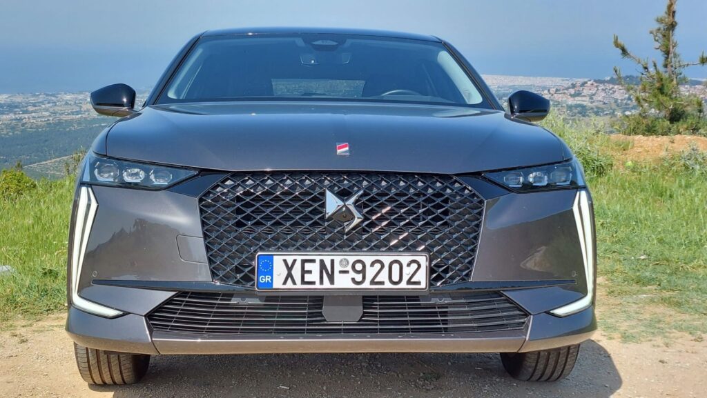 Στο κέντρο κυριαρχεί η μεγάλη εξάγωνη γρίλια της DS, που ενώνεται με τα φώτα και την κεντρική εισαγωγή αέρα μέσω των χρωμιωμένων DS Wings. Στο πλάι, οι αναδυόμενες χειρολαβές έρχονται σε πλήρη αρμονία με το σύνολο, ενώ στο πίσω μέρος τη διαφορά κάνει η έντονη κλίση του παρμπρίζ, το οποίο σκεπάζεται από αεροτομή και οι πλευρές του αποτελούν συνέχεια της γραμμής της οροφής. Η έκδοση της δοκιμής μας είναι η Performance line, που δίνει βαρύτητα στα δυναμικά χαρακτηριστικά, ενώ υπάρχει και έκδοση Cross με ακόμη πιο “κροσσοβερίζοντα” προσανατολισμό.