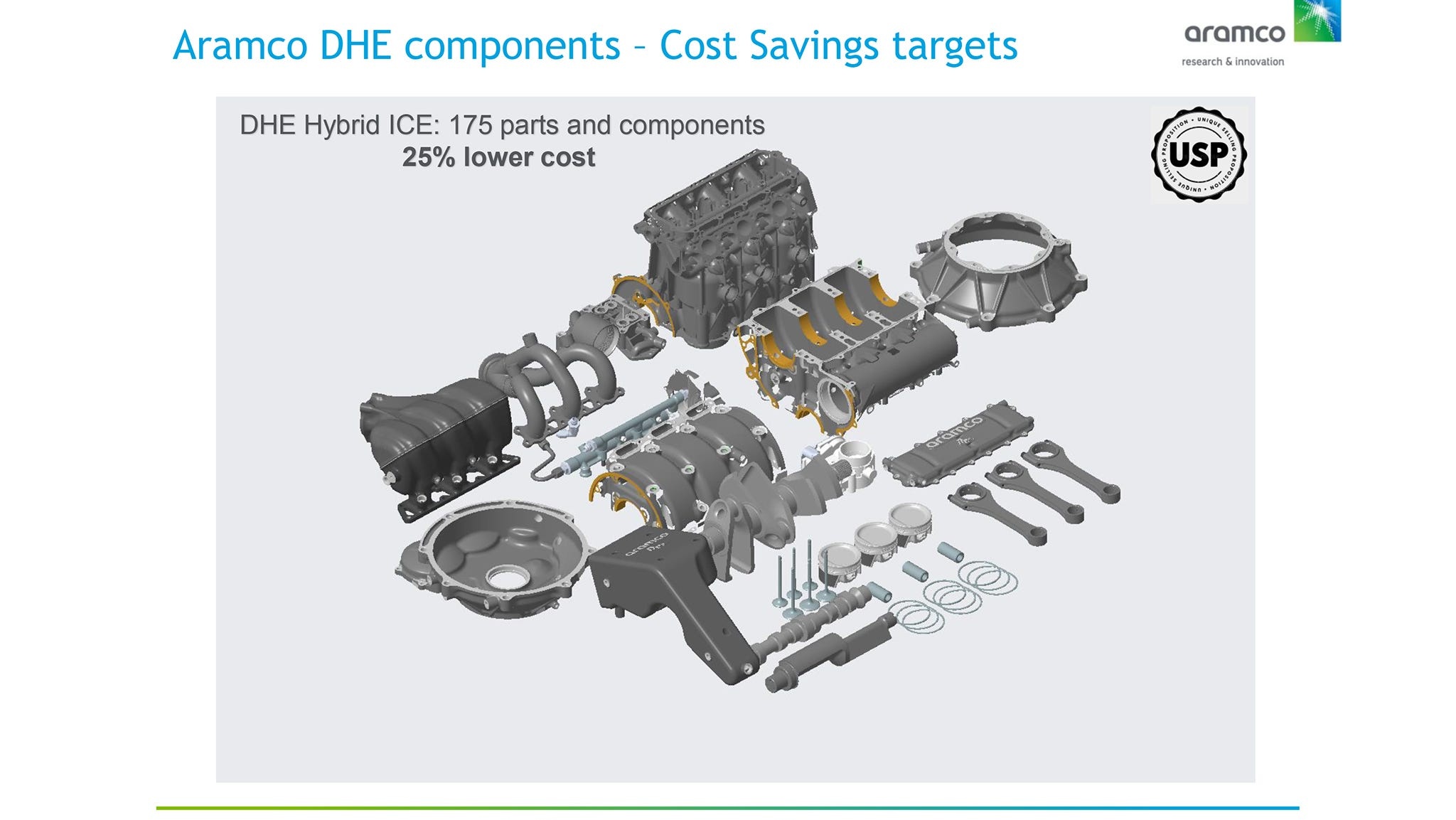 Ο πρώτος DHE που δημιουργήθηκε παίρνει τη μορφή ενός τρικύλινδρου, ατμοσφαιρικού βενζινοκινητήρα με χωρητικότητα 1.6 λίτρα. Το μπλοκ και η κυλινδροκεφαλή χυτεύονται ως ένα, ενιαίο εξάρτημα ενώ χαρακτηριστικό της φιλοσοφίας βάσει της οποίας σχεδιάστηκε ο κινητήρας είναι το γεγονός ότι χρησιμοποιεί έναν εκκεντροφόρο και αυτός δεν είναι επί κεφαλής όπως συμβαίνει στην συντριπτική πλειοψηφία των σύγχρονων θερμικών κινητήρων. Επίσης, ο κινητήρας της Aramco διαθέτει “μόνο” δύο βαλβίδες ανά κύλινδρο και κανενός είδους σύστημα μεταβλητού χρονισμού ενώ έχει ληφθεί κάθε μέτρο ελαχιστοποίησης των τριβών στο εσωτερικό του κινητήρα και περιορισμού των παρασιτικών απωλειών, συμπεριλαμβανομένης της ηλεκτρικής λειτουργίας όλων των βοηθητικών εξαρτημάτων όπως για παράδειγμα η αντλία νερού!
