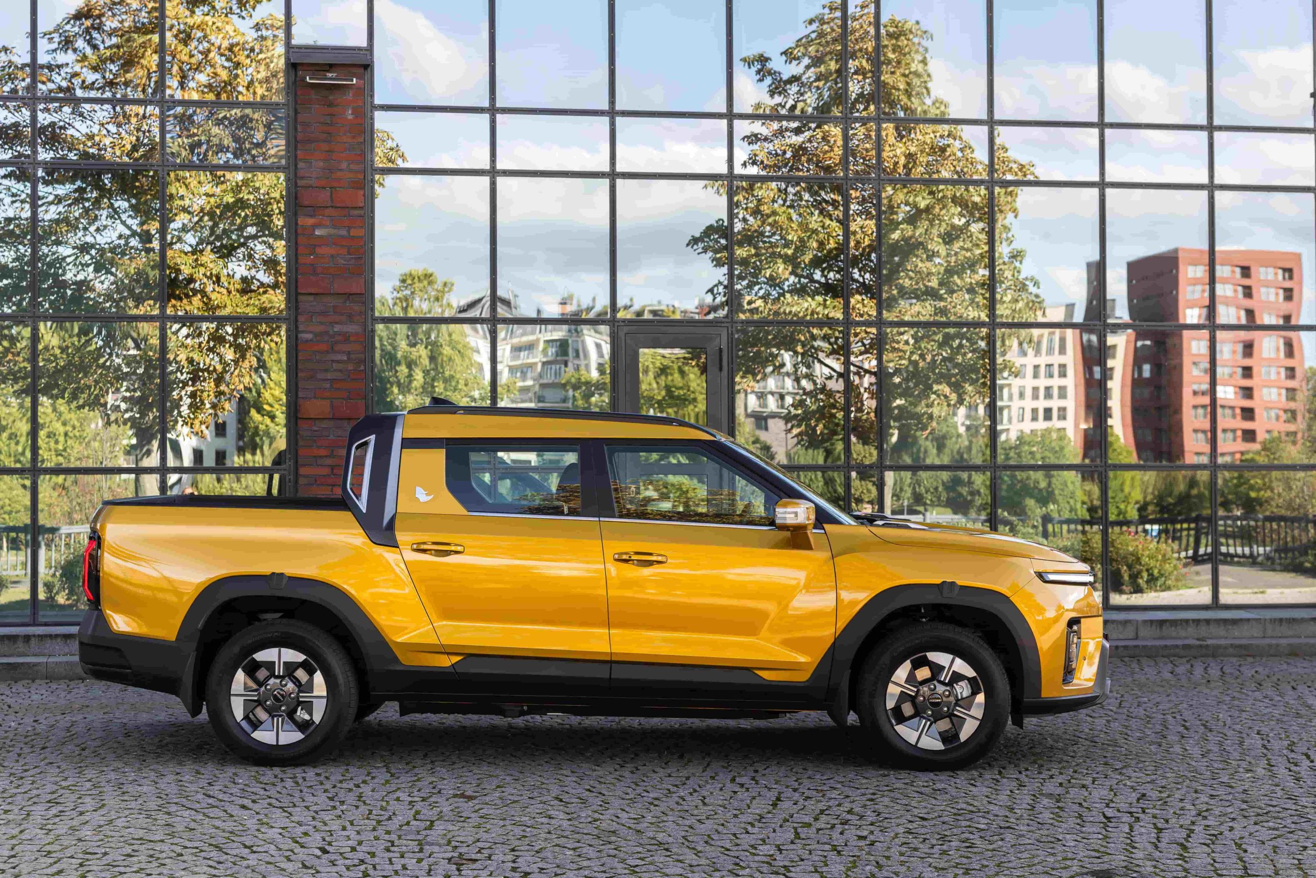 Ο προφυλακτήρας με τρισδιάστατη γρίλια, τα καλύμματα γάντζων ρυμούλκησης και οι ασημένιες προστατευτικές ποδιές ολοκληρώνουν την σκληροτράχηλη εικόνα. Το προφίλ του Musso EV ισορροπεί ανάμεσα στην κομψότητα ενός επιβατικού αυτοκινήτου και τη χρηστικότητα ενός pick-up. Οι έντονες γραμμές, οι τονισμένοι θόλοι των τροχών και οι προστατευτικές διακοσμητικές λεπτομέρειες στις πόρτες αποπνέουν δυναμική ενέργεια. Οι γωνιακοί καθρέφτες σε στυλ σημαίας και οι ζάντες 17 ιντσών diamond cut ολοκληρώνουν τη μινιμαλιστική αλλά στιβαρή σχεδίαση. Στο πίσω μέρος, η πρακτικότητα συνδυάζεται με τον τολμηρό χαρακτήρα. Το μεγάλο έμβλημα KGM και τα πίσω φώτα LED, εμπνευσμένα από εργαλεία, αποπνέουν δύναμη, ενώ τα προστατευτικά καλύμματα του χώρου φόρτωσης ενισχύουν την ανθεκτικότητα.