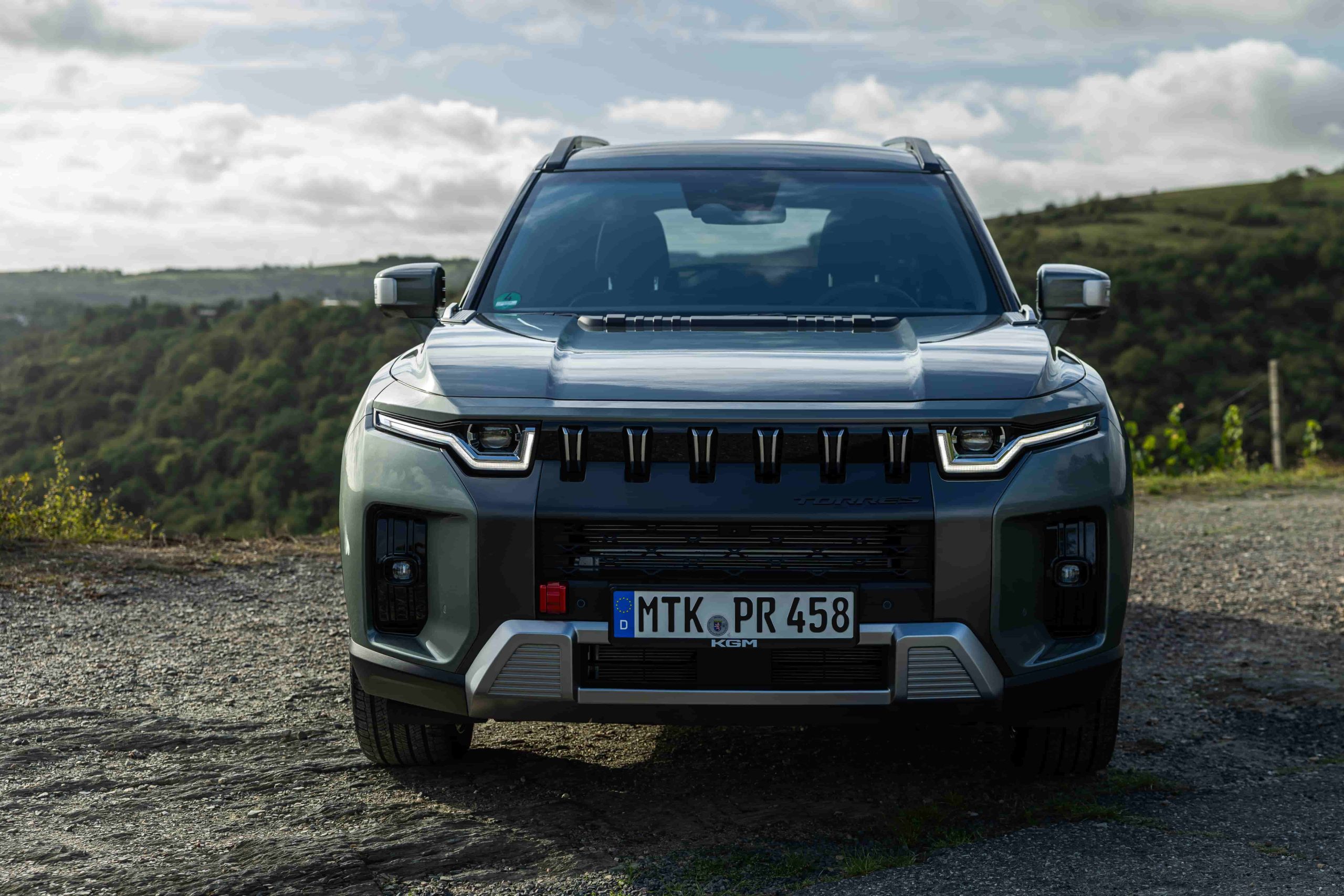 Το Torres Hybrid αποτυπώνει τον αυθεντικό χαρακτήρα SUV, βασισμένο στο σχεδιαστικό όραμα της KGM και τη φιλοσοφία ‘‘Powered by Toughness’’, που συνδυάζει δύναμη και μοντέρνα αισθητική. Στο εμπρός μέρος, οι δυναμικές γραμμές δημιουργούν έντονη παρουσία, οι οποίες ισορροπούνται από κομψές λεπτομέρειες. Η κάθετα προσανατολισμένη μάσκα με μοτίβο πλέγματος και ο ενσωματωμένος προστατευτικός προφυλακτήρας στο κάτω μέρος, αναδεικνύουν την περιπετειώδη εικόνα του. Οι προβολείς LED που ενώνονται με τη μάσκα προσθέτουν γοητεία, με ένα τρισδιάστατο μοτίβο DRL εμπνευσμένο από τον αστερισμό της Μεγάλης Άρκτου, που αλλάζει ανάλογα με τη γωνία θέασης. Οι έντονες γραμμές του καπό ενισχύουν την αίσθηση δύναμης, ενώ μια λειτουργική διακοσμητική λεπτομέρεια στο καπό επιτρέπει την τοποθέτηση αξεσουάρ, όπως GoPro ή προστατευτικό εξοπλισμό. Τα φώτα ομίχλης σε σχήμα τετραγώνου που είναι τοποθετημένα χαμηλά σε κάθε πλευρά ενισχύουν περαιτέρω τη στιβαρή εικόνα.