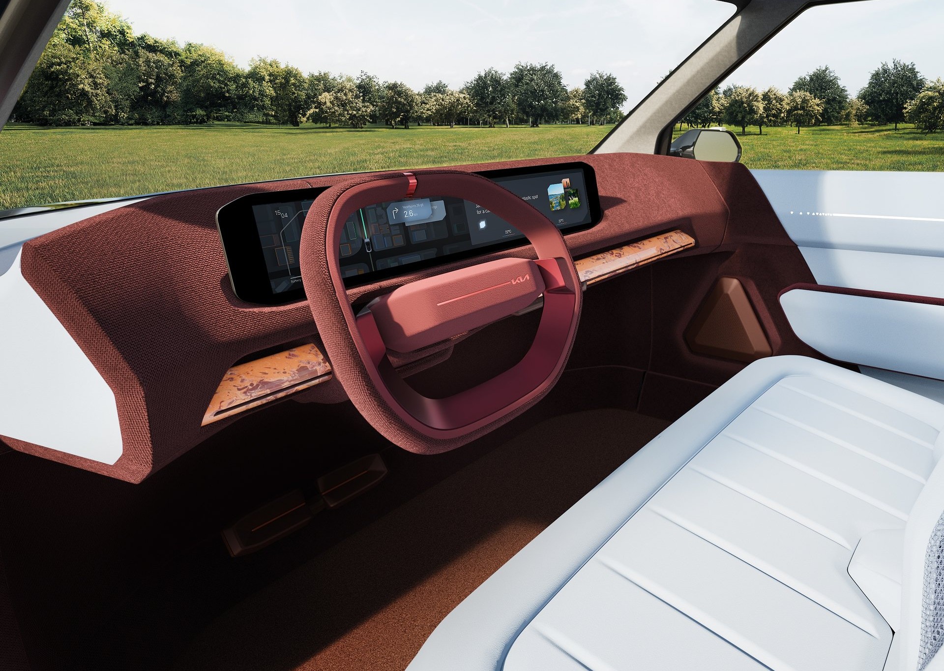 Η Kia έδωσε στη δημοσιότητα φωτογραφίες και από την καμπίνα του Concept EV2 που είναι αναμενόμενα λιτή και μινιμαλιστική. Εδώ, στο εσωτερικό, ενδεχομένως να έχουμε περισσότερες και πιο σημαντικές αλλαγές κατά την μετάβαση από το στάδιο του πρωτότυπο σε αυτό του μοντέλου παραγωγής αλλά θα πρέπει να περιμένουμε να δούμε ποιες από τις ενδιαφέρουσες ιδέες των σχεδιαστών θα πάρουν το πράσινο φως. Όσον αφορά στο design πάντως, την παράσταση κλέβει η επιλογή για ένα ενιαίο κάθισμα “αμερικανικού” τύπου για τον οδηγό και τον συνοδηγό που υποθέτουμε ότι δεν θα περάσει στην παραγωγή για προφανείς λόγους, το μεγάλο πάνελ που φιλοξενεί τον ψηφιακό πίνακα οργάνων και την οθόνη του συστήματος infotainment και τα τριγωνικά ηχεία στις πόρτες που αφαιρούνται για να γίνουν φορητά ώστε να εξυπηρετήσουν τις μουσικές ανάγκες των επιβατών στις εξορμήσεις τους. Εξαιρετικό ενδιαφέρον έχει και η δυνατότητα του εμπρός… πάγκου να συρθεί προς τα πίσω με την αναδίπλωση των πίσω καθισμάτων επιτρέποντας στους επιβάτες του εμπρός μέρους να απλώσουν τα πόδια τους και να χαλαρώσουν, όταν το όχημα είναι σταθμευμένο για παράδειγμα.