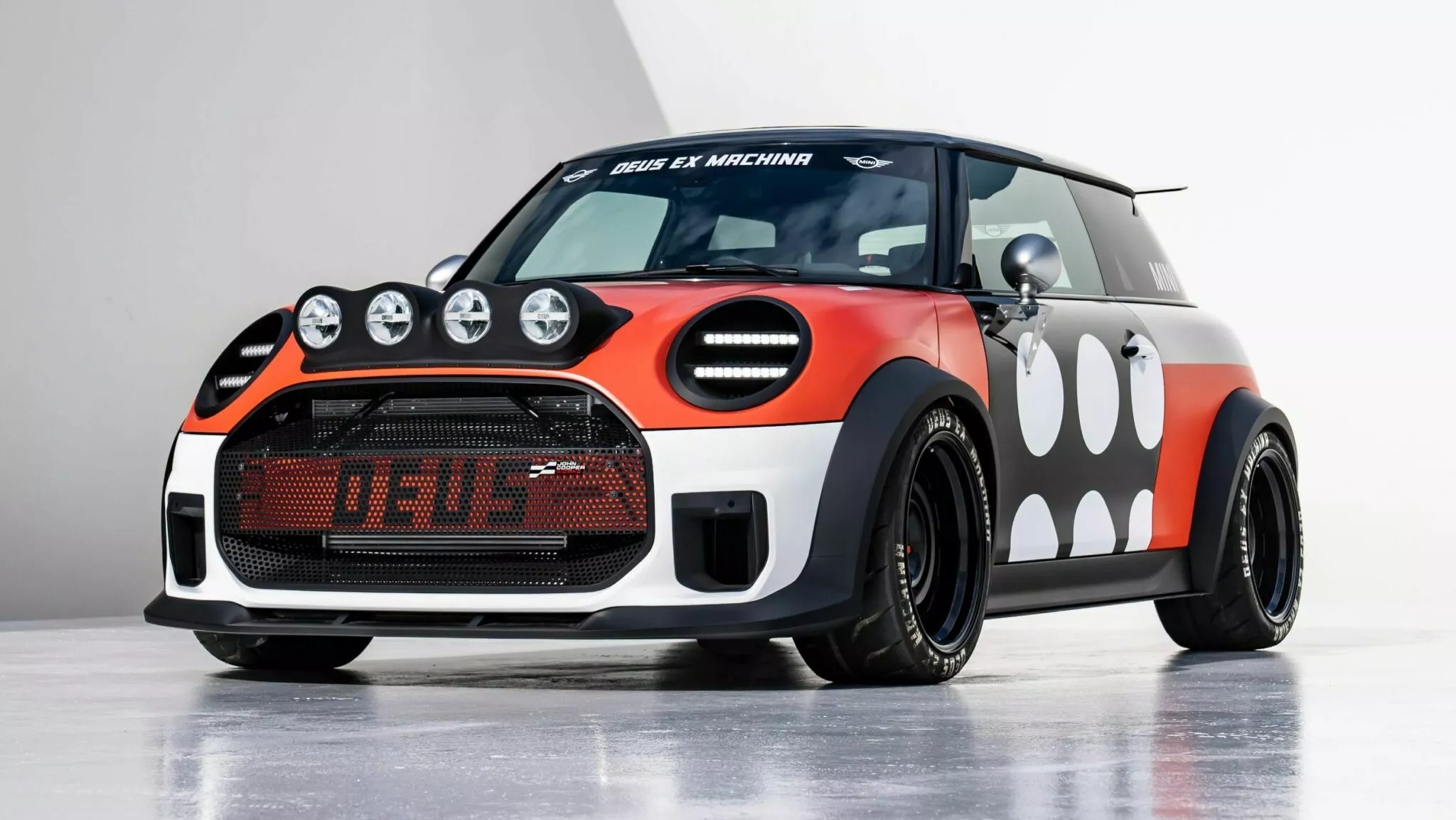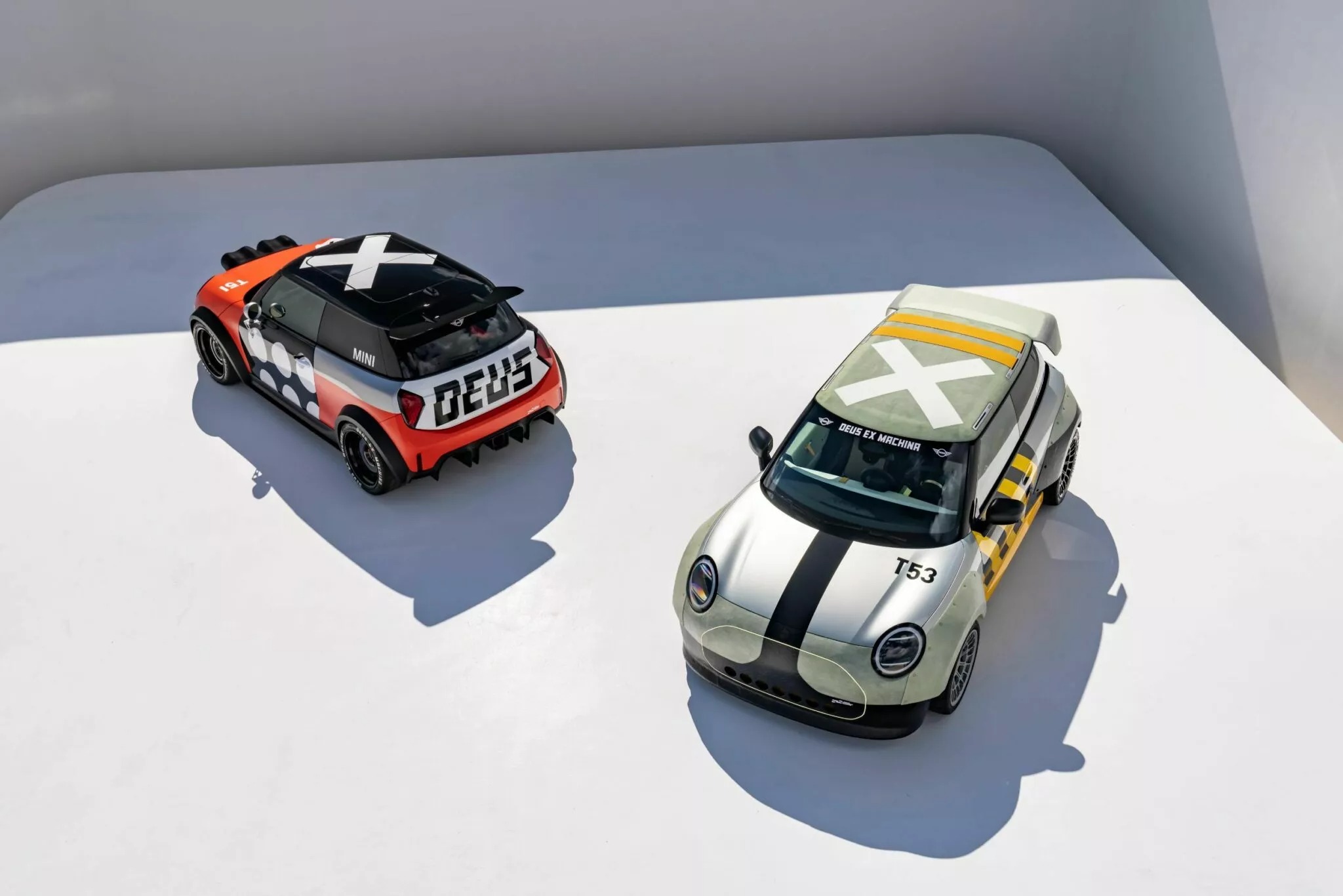Με βαθύ σεβασμό στην κατασκευαστική δεξιοτεχνία, την κουλτούρα και τις κοινότητες που τα διαμορφώνουν, η συνεργασία της MINI John Cooper Works με τη Deus Ex Machina ζωντανεύει μέσα από δύο εξατομικευμένα one-off αυτοκίνητα που αποτελούν ζωντανές εκφράσεις ενός τρόπου ζωής όπου η αγάπη για την ταχύτητα συναντά τη δημιουργικότητα και τον προσεγμένο σχεδιασμό. Σχεδιασμένα όχι μόνο με γνώμονα τις επιδόσεις, αλλά και για τους ανθρώπους που ζουν και αναπνέουν μέσα από αυτές. Τα δύο πρωτότυπα οχήματα βασίζονται σε προτάσεις της MINI John Cooper Works: το πρώτο, ένα MINI JCW Electric με ισχύ έως 258 ίππους και το δεύτερο, ένα MINI JCW με θερμικό κινητήρα που αποδίδει 231 ίππους. Η οροφή κάθε οχήματος κοσμείται από ένα μεγάλο λευκό «Χ», στοιχείο που συμβολίζει τη συνεργασία και τη δημιουργική σύμπραξη μεταξύ δύο εμβληματικών εμπορικών σημάτων: MINI JCW x DEUS.