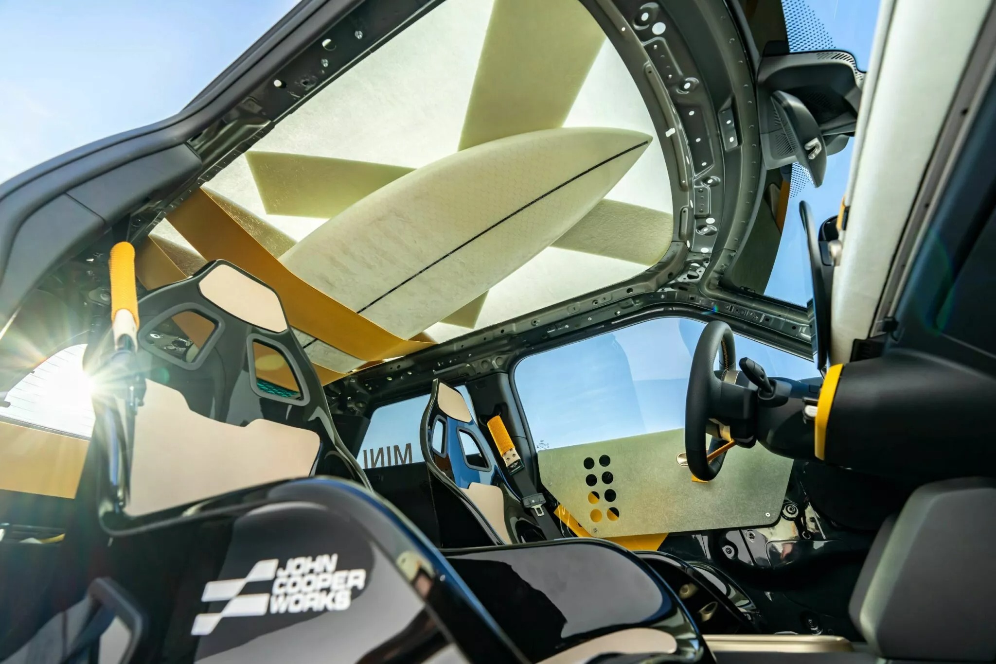 Η εξοικονόμηση βάρους αντανακλάται σε κάθε επιφάνεια, από τα λιτά πάνελ των θυρών με τα τολμηρά λευκά μοτίβα «X», μέχρι το ταμπλό από κερωμένο ύφασμα – ελαφρύ, ανθεκτικό και με φινίρισμα που αποπνέει αυθεντικό, χειροποίητο χαρακτήρα. Από πάνω, το εκτεθειμένο roll cage προσδίδει στιβαρότητα και δυναμισμό, ενισχύοντας την ασφάλεια και υπογραμμίζοντας το αφιλτράριστο αγωνιστικό DNA του αυτοκινήτου. Τα χειριστήρια του πρωτοτύπου αποπνέουν λειτουργικότητα και αμεσότητα. Κάθε διακόπτης και κουμπί έχει σχεδιαστεί ώστε να λειτουργεί διαισθητικά και αξιόπιστα, ακόμα και σε ακραίες συνθήκες. Οι διακόπτες toggle είναι κλασικά στοιχεία – χωρίς περίπλοκα μενού, μόνο άμεσες, μηχανικές συνδέσεις ανάμεσα στην πρόθεση του οδηγού και τη λειτουργία του οχήματος. Κάθε διακόπτης έχει σαφή και συγκεκριμένο ρόλο. Ένα χαρακτηριστικό παράδειγμα είναι το υδραυλικό χειρόφρενο με τον μεγάλο μοχλό του, που προσφέρει άμεση σύνδεση ανάμεσα στον οδηγό και το όχημα διασφαλίζοντας ακρίβεια και έλεγχο. Το πρωτότυπο JCW αποτελεί ένα μανιφέστο οδήγησης και φόρο τιμής στο αγωνιστικό DNA της MINI.