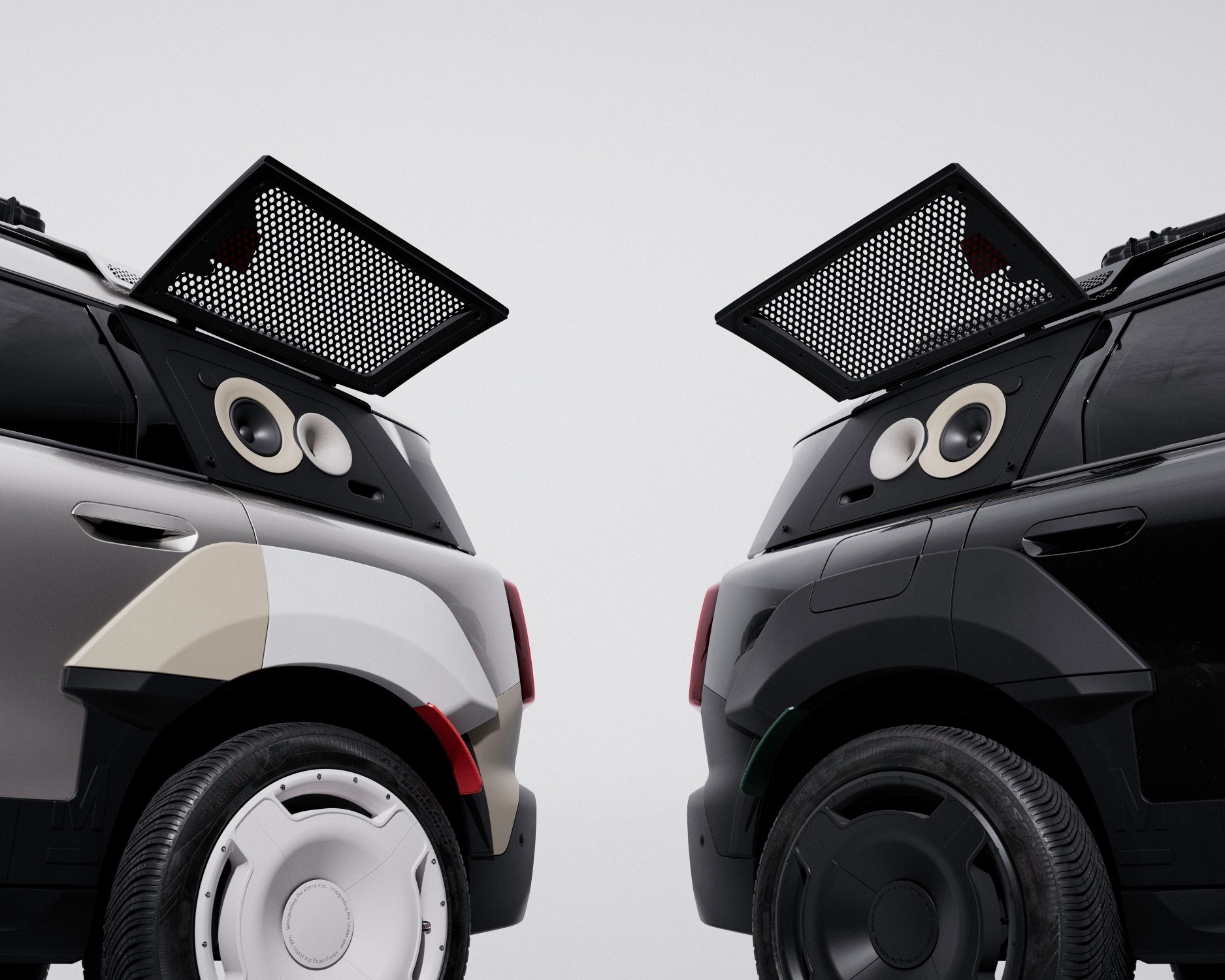 Τα πίσω πλευρικά παράθυρα έχουν αφαιρεθεί και αντικατασταθεί από ένα ειδικά σχεδιασμένο ηχοσύστημα, για υπαίθρια χρήση και κοινοτικές εκδηλώσεις. Στο επίκεντρό του βρίσκεται ένα νέο περίβλημα ηχείων από χυτό πολυμερικό γρανίτη – ένα υλικό που προσφέρει ιδανικές συνθήκες για καθαρή και πιστή αναπαραγωγή ήχου. Tweeters και ηχεία μεσαίων συχνοτήτων είναι ενσωματωμένα απευθείας στο αμάξωμα, ενώ πρόσθετα subwoofers στο πίσω μέρος προσφέρουν ισχυρή απόδοση μπάσων όταν ανοίγει η πίσω πόρτα. Κάθε όχημα λειτουργεί ως αυτόνομο ηχοσύστημα – μαζί, όμως, τα δύο εκθεσιακά MINI Countryman συνθέτουν μια κινητή σκηνή, δημιουργώντας μια καθηλωτική ηχητική εμπειρία. Στην άλλη πλευρά του οχήματος διακρίνεται μια ιδιαίτερη λεπτομέρεια: ένα εμβληματικό Walkman, ενσωματωμένο σε περίβλημα κατασκευασμένο με 3D εκτύπωση. Με το χαρακτηριστικό χιούμορ της MINI, δημιουργείται μια σκόπιμη αντίθεση με το ανοιχτό εξωτερικό ηχοσύστημα, προσδίδοντας μια πιο προσωπική, “χαμηλών τόνων” διάσταση. Ο συνδυασμός της αναλογικής νοσταλγίας και της σύγχρονης προσθετικής κατασκευής υπογραμμίζει τον πειραματικό χαρακτήρα του συνολικού concept.