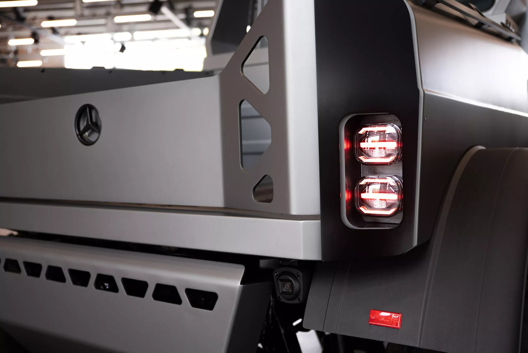 Όσον αφορά στην εμφάνιση, το… επετειακό Unimog είναι ένα περίεργο θέαμα. Δεν έχει χάσει απολύτως κανένα από τα off-road χαρακτηριστικά του καθώς την παράσταση κλέβει ακόμα το επιβλητικό μέγεθος, οι τεράστιοι τροχοί με τις 20άρες beadlock ζάντες και τα all-terrain ελαστικά, η σχεδόν απόλυτα τετράγωνη καμπίνα και το άκρως λειτουργικό design όμως υπάρχουν πινελιές που αναβαθμίζουν την αισθητική στον βαθμό που επιτρέπει το σχήμα του Unimog. Πινελιές όπως τα LED φωτιστικά σώματα για παράδειγμα, η αντικατάσταση των συμβατικών καθρεπτών με κάμερες και το ματ γκρι χρώμα.